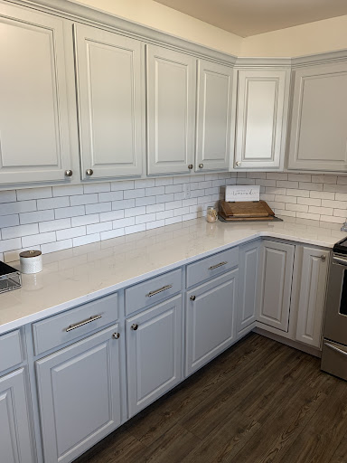 White Quartz Countertops Greige Cabinets Backsplash Farmhouse Kitchen Backsplash Taupe Kitchen Stone Backsplash Kitchen